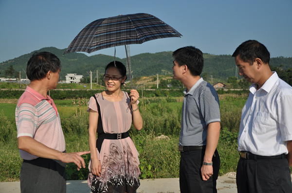 8月19日,邵瑛(左一)在雙峰縣三塘鋪鎮(zhèn)調研時,聽取鎮(zhèn)領導關于移民區(qū)的規(guī)劃匯報