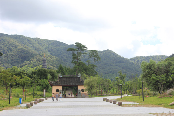 從“鳳崗修竹”上到半山腰的千佛塔,天童寺風(fēng)光盡收眼底:山頂藍(lán)天白云;山坡茂林修竹;山腳紅墻寺院?!拔乙娗嗌蕉鄫趁摹?,用來形容天童寺的山水形勝,最為恰當(dāng)。而且我認(rèn)為“嫵媚”一詞,即是江浙山山水水與江浙人性格的全部寫真!