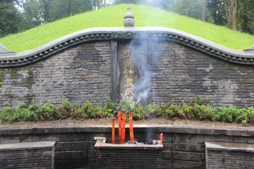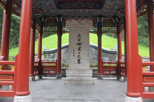 亭閣后面堆起了一個(gè)小山包,四周用青磚砌墻,正中有“炎帝神農(nóng)氏墓”幾個(gè)黃色大字,墓前擺放著一個(gè)磚徹香案,供后人焚香祭拜之用。