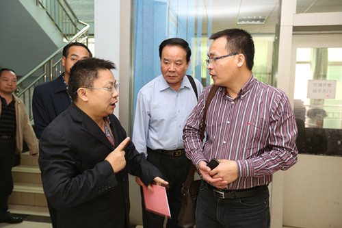 廖華(左)陪專家組成員涂昌森(右)、張致光(中)等考察