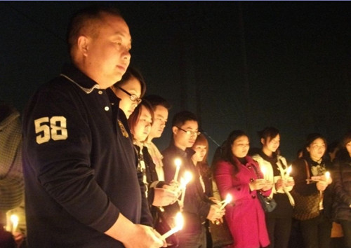 潘杰(左1)與集團全體員工一道為雅安祈福