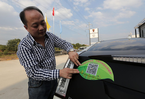 長潘杰親手張貼“綠絲帶”創(chuàng)衛(wèi)行動宣傳標語