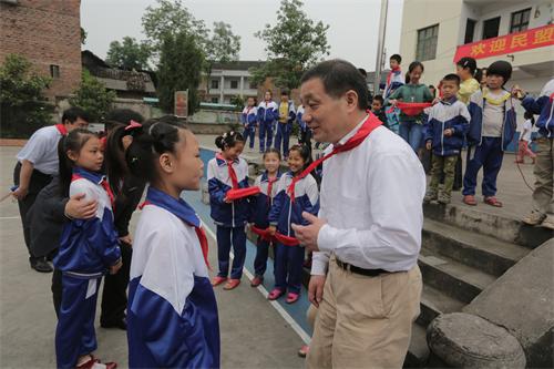 楊維剛還與學(xué)生進(jìn)行了親切交流,詢問他們的學(xué)習(xí)、生活情況,希望他們健康成長(zhǎng),長(zhǎng)大后做一個(gè)對(duì)社會(huì)有用的人。孩子們?yōu)檫h(yuǎn)道而來的客人系上了紅領(lǐng)巾。