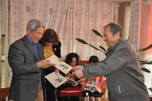 歐老(右)向大家贈送作品集