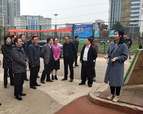 姚兵(左2)、王雄(左1)等考察楚英學(xué)校,聽(tīng)取肖鵬(右3)介紹學(xué)校情況