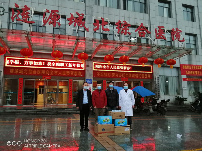 漣源市城北醫(yī)院院長劉首紅(左二)為七星街鎮(zhèn)捐贈(zèng)防疫物質(zhì)