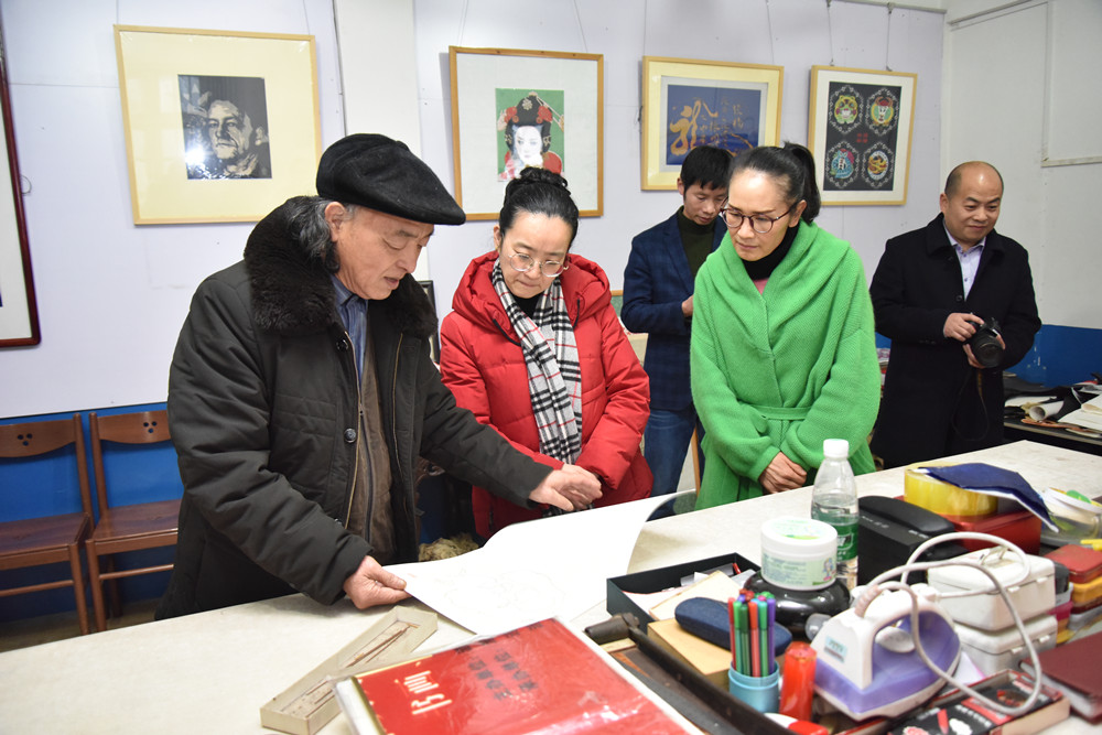 在盟員姜新民工作室,胡穎一行參觀了老藝術(shù)家姜新民的藝術(shù)作品,對(duì)姜新民老盟員數(shù)十年如一日,孜孜以求,熱愛(ài)藝術(shù)表示敬佩,對(duì)其精湛絕倫的火烙畫(huà)藝術(shù)表示驚嘆,并祝福姜老身體健康、藝術(shù)長(zhǎng)青。胡穎還接見(jiàn)了漣源文化館盟員藝術(shù)家姚垚、姜藝等,表?yè)P(yáng)她們?yōu)榭箵粜鹿诜窝滓咔閯?chuàng)作文藝作品。